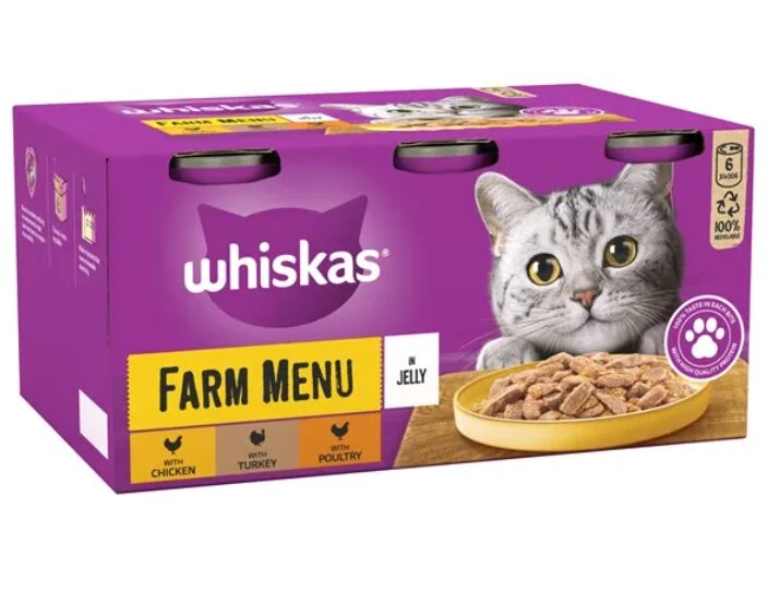 Whiskas 1+ Farm Menu adult canned cat food in jelly. Each pouch has two flavours and provides 100% complete & balanced cat food in jelly.