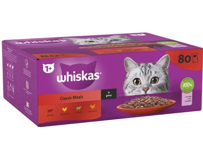 Whiskas 1+ Meaty Meals adult cat food pouches in gravy. Each pouch has two flavours and provides 100% of your cat’s daily needs.