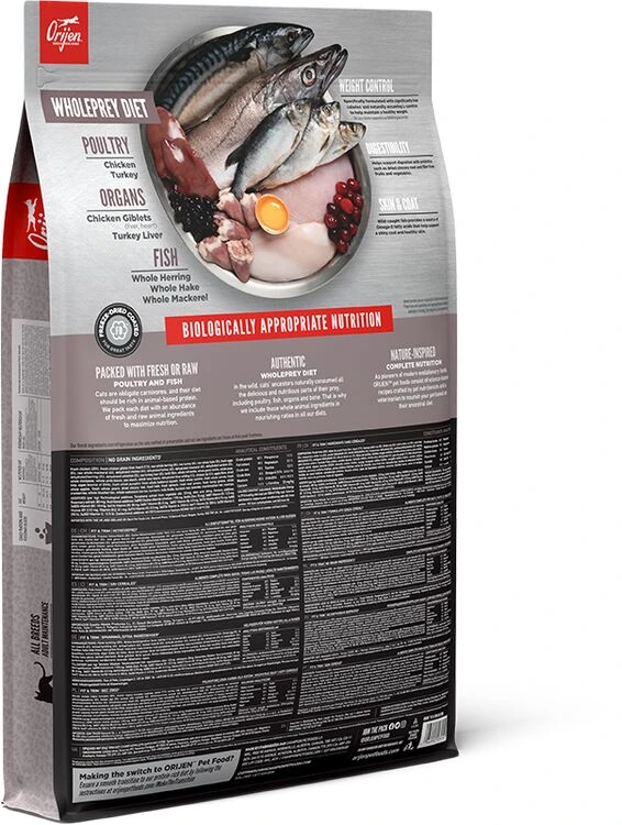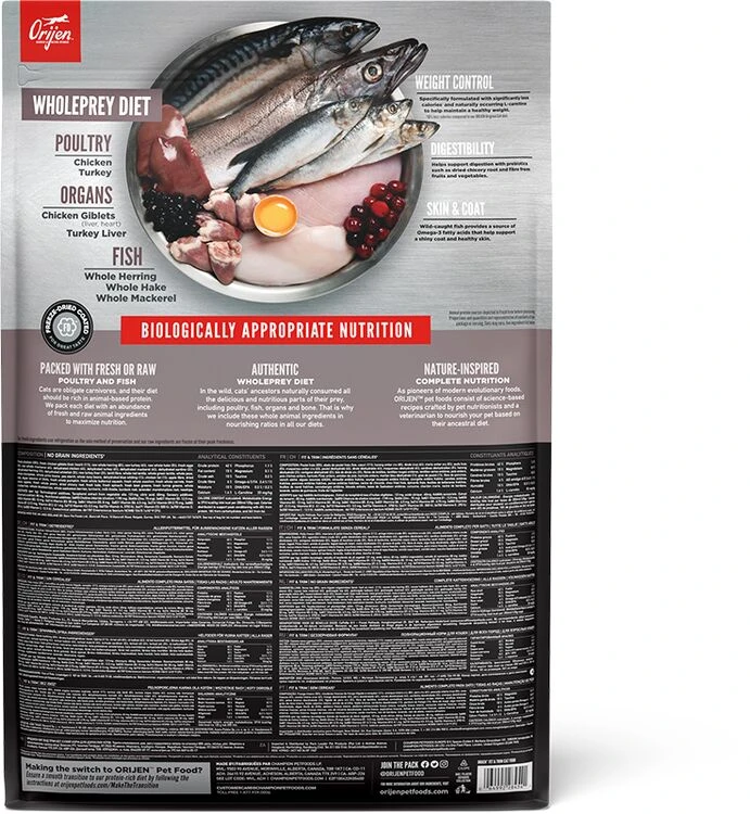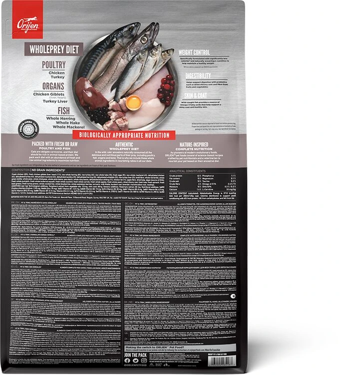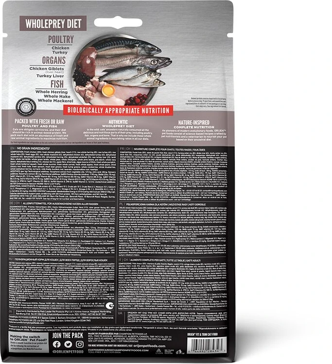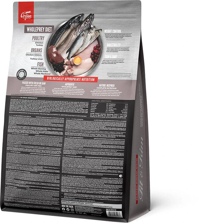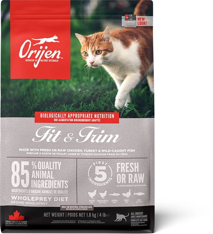 Orijen Fit & Trim Dry Cat Food is rich in protein and is wonderfully delicious, perfect for promoting peak body conditioning and to help overweight cats stay healthy. It will help to support lean muscle mass and contains fresh chicken, turkey and fish.Â