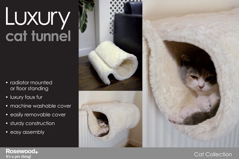 With a design that allows it to be stood on the floor or safely mounted onto a standard home radiator, the Rosewood Radiator Luxury Mounted Cat Tunnel Bed is made from a comfortable faux fur material that cats just love to laze and lounge around in.