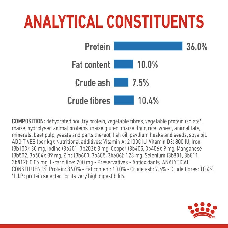 Ingredients: Dehydrated poultry protein, vegetable fibres, vegetable protein isolate*, maize, hydrolysed animal proteins, maize gluten, maize flour, rice, wheat, animal fats, mineral, beet pulp, yeasts and parts thereof, fish oil, psyllium husks and seeds, soya oil. *LIP: protein selected for its very high digestibility.